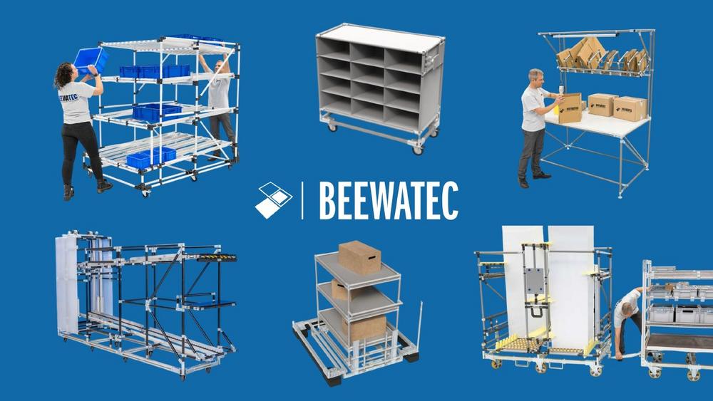 Ob Montagearbeitsplatz, Packplatz, Durchlaufregal, Transportwagen oder komplette Linie: Mit dem BeeWaTec Systembaukasten entstehen individuelle Lösungen auf Basis von Stahl- und Aluminium-Rohrsystemen, Vierkantsystemen sowie einem breiten Portfolio an Anbauteilen und Zubehör.