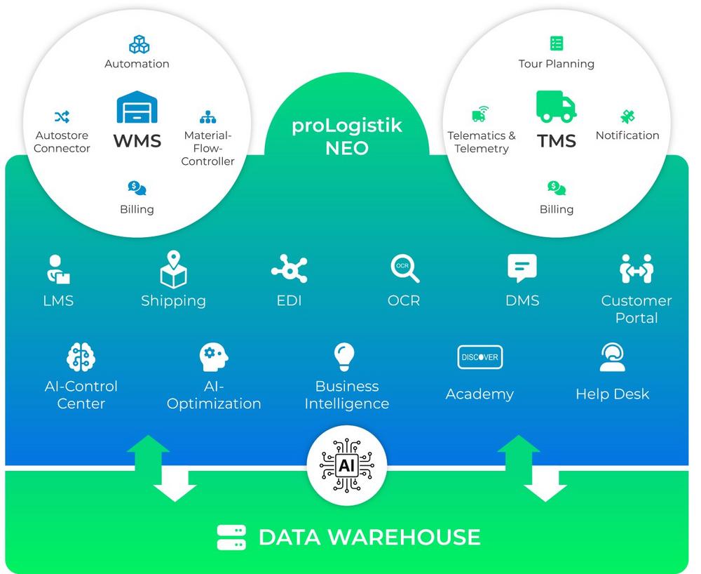Die modulare, datengetriebene Plattform proLogistik NEO vereint nicht nur WMS und TMS sondern auch Business Intelligence und den KI-Leitstand „AI Control Center“ in einer zentralen Oberfläche. proLogistik NEO bietet Funktionen wie Single Sign-On, rollenbasierte Zugriffe und zentrale Stammdatenpflege. Dies reduziert Integrationsaufwände, erhöht die Transparenz und beschleunigt Entscheidungen entlang der gesamten Supply Chain. Ein zentrales Data Warehouse konsolidiert Daten aus eigenen Lösungen und Drittsystemen und schafft so eine einheitliche Datenbasis.