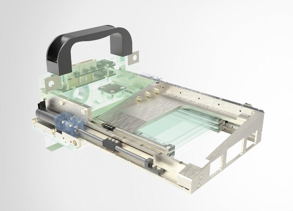 Ein Paradebeispiel für die hohe Innovationskraft der Steinmeyer-Gruppe ist die ultrakompakte, hochpräzise Positionierlösung zur Wafer-Belichtung in trockener, sauerstofffreier Stickstoff-Atmosphäre. Dabei handelt es sich um einen ergänzenden Polarisationsfilter für die Miniaturisierung und Automatisierung in der DUV-Lithografie. „Die DUV-Lithographie nutzt tief-ultraviolettes Licht mit Wellenlängen von 193 oder 248 nm und ermöglicht besonders kleine Strukturgrößen bei Mikrochips. Unsere Aufgabe war es, für einen Wafer-Stepper eine nachrüstbare Filtereinheit zum Anpassen der optischen Eigenschaften des Lichtstrahls zu entwickeln“, so Elger Matthes, Entwicklung und Produktmanagement bei Steinmeyer Mechatronik, und erzählt: „Da die Baugruppe als optionales Add-on zur Integration in eine bestehende Maschine konzipiert war, stand uns nur sehr wenig Bauraum zur Verfügung. Weitere Anforderungen waren minimale Verstellwege, Stabilität im Stillstand – das Setting sollte nur alle paar Minuten gewechselt werden – sowie bestimmte Vorgaben an die Geschwindigkeit, Wiederholbarkeit und Lebensdauer.“