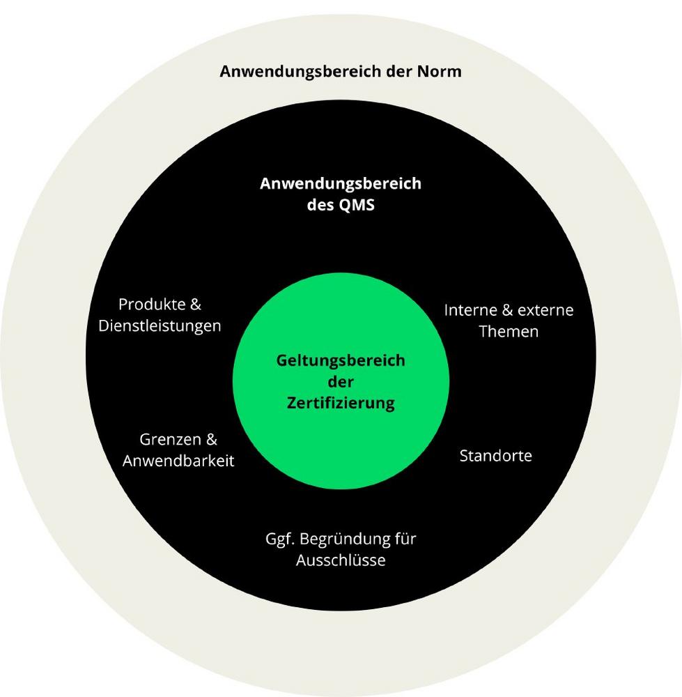 Den Geltungsbereich der Zertifizierung darf jede Organisation selbst wählen. In den meisten Fällen umfasst er – wie der Anwendungsbereich des Managementsystems – die ganze Organisation. Aber es sind auch Situationen denkbar, in denen eine Organisation nicht all ihre Tätigkeiten oder Standorte in die Zertifizierung einbeziehen möchte. Bei einem Ausschluss sind neben rechtlichen Aspekten (z. B., wenn eine Zertifizierung gesetzlich oder behördlich gefordert wird) dabei vor allem inhaltliche Aspekte zu beachten. So ist es nicht möglich, Tätigkeiten oder Standorte auszuschließen, ohne die die zertifizierten Tätigkeiten nicht anforderungsgerecht erbracht werden können.